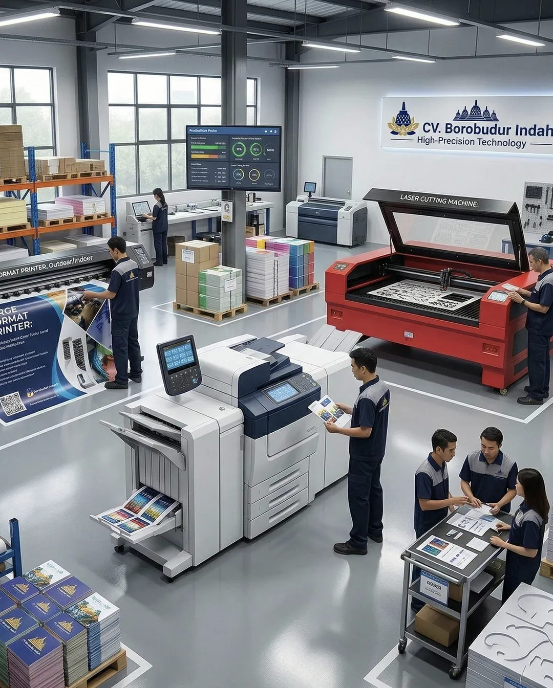 Kami memahami bahwa konsistensi warna brand dan ketepatan waktu adalah segalanya bagi bisnis Anda. CV Borobudur Indah mengintegrasikan seluruh fasilitas produksi di bawah satu atap. Lebih efisien, lebih konsisten, dan minim risiko.